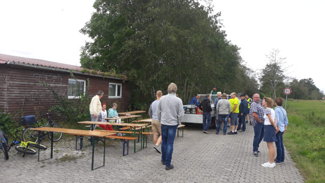 Frisch gestärkt fuhren wir Richtung Großheide wo wir am Betonwerk in Arle unsere erste Pause einlegten. Heiko Bengen und Erik Buß, die sich bereiterklärt haben uns auf der Strecke zu beköstigen, hatten schon Tische und Bänke aufgebaut und versorgten uns mit kühlen Getränken. Vielen Dank an die beiden.